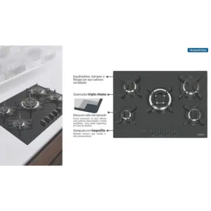 Cooktop a Gás em Vidro Temperado Preto com Acendimento Automático Penta 5 Queimadores