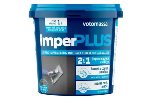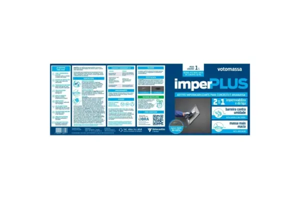 O Aditivo Impermeabilizante para Concreto e Argamassa Imperplus 1 Litro da Votoran é um aditivo que impermeabiliza concreto e argamassas por hidrofugação do sistema capilar e confere maior plasticidade. Revestimento de caixa d’água, piscinas, reservatórios, baldrames, paredes de encosta e assentamento de alvenaria: 900mL a 1 L de imperplus para meio saco de cimento de 50kg. Concretos de baixa permeabilidade: 500mL de imperplus para saco de cimento de 50kg.