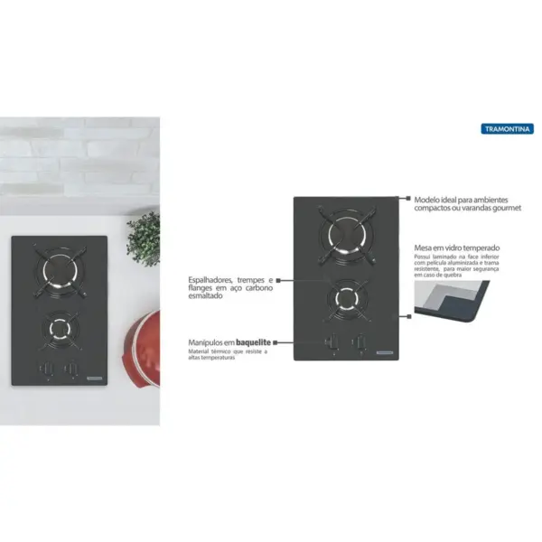 Escolher bem os eletrodomésticos para cozinhar é fundamental. Então aí vai uma dica: Compre o Cooktop a Gás Tramontina Dominó 2GG 30 em Vidro Temperado Preto, Trempes em Aço Carbono com Acendimento Automático e 2 Queimadores da linha Perfecta.