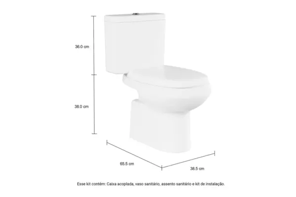 | Dimensões aproximadas de cada peça (AxLxP): | Bacia: 38 x 38,5 x 65,5 cm; Caixa Acoplada: 36 x 39 x 17 cm |