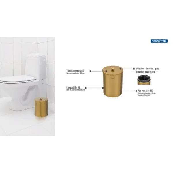 Lixeira útil em Aço Inox Polido com Revestimento Especial a Base de Verniz Gold 5 L – Tramontina