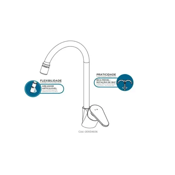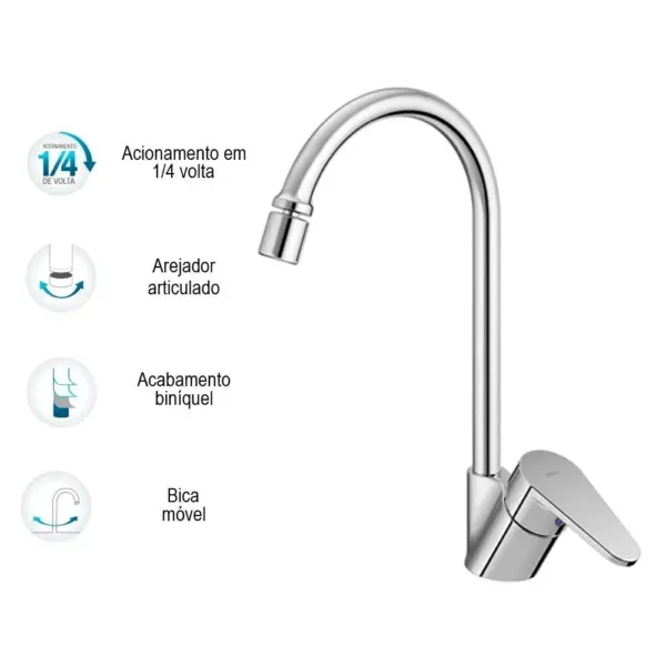 O principal benefício dessa linha é a sua resistência e funcionalidade durante o uso dos produtos. Com o monocomando para cozinhas você tem o conforto da água quente e fria para lavar louças e as mãos a qualquer momento. O acionamento é em apenas um volante, ou seja, você liga a água e regula a temperatura na mesma peça. Esse produto possui bica giratória e arejador articulável, para tornar o uso da água mais prático no dia a dia da cozinha. Por ser monocomando, o produto ocupa menos espaço na bancada para uma cozinha ainda mais bonita e funcional