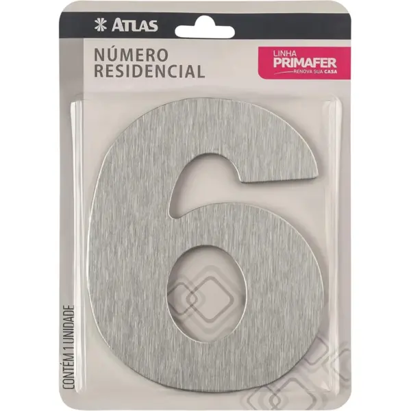 Número Residencial de Alumínio Escovado com Adesivo – 6 (seis) – Cor Prata – Linha Primafer – Atlas.