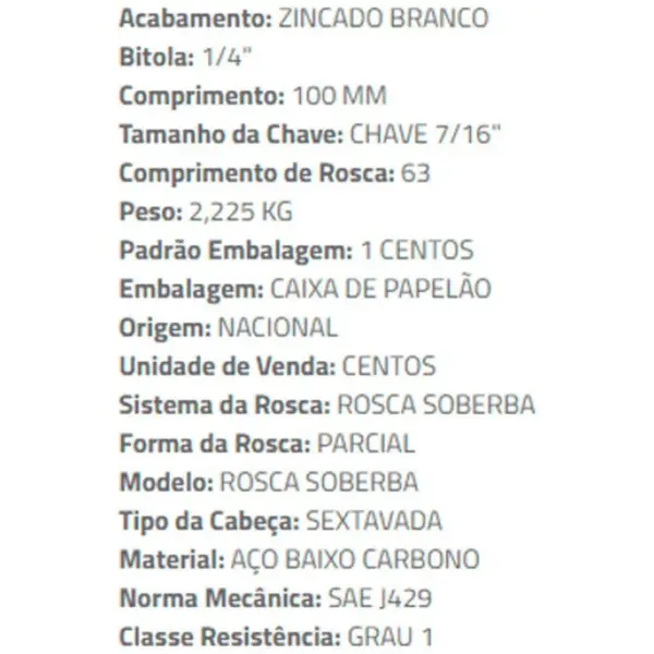 Parafuso Sextavado Rosca Soberba 1/4 X 100 Zn Br Caixa com 100 – Ciser