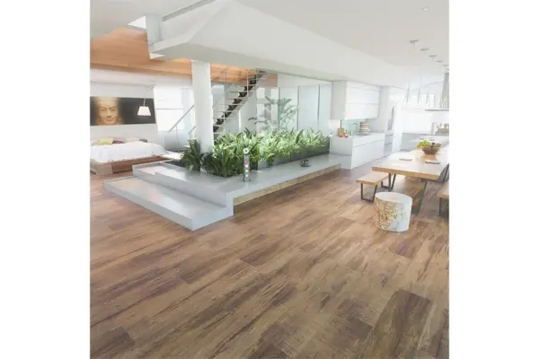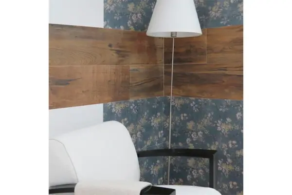 O Porcelanato Esmaltado Acetinado Borda Reta Demolição é recomendado tanto para áreas internas quanto externas e seu design na cor marrom remete à superfície de madeira, incorporando aspecto orgânico à decoração.