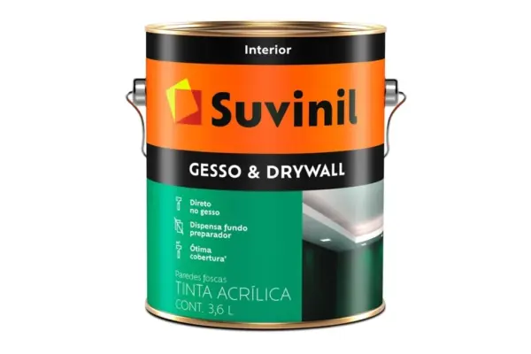 A Tinta Acrílica para Gesso e Drywall Fosco Branco 3,6 Litros da Suvinil preenche cada poro da sua superfície e fixa partículas sem precisar de nenhum outro fundo. Tudo isso com uma ótima cobertura seca. É indicada para aplicação em interiores diretamente sobre gesso e placas de gesso comum ou acartonado (drywall). Quando usada como fundo sobre gesso permite a aplicação das tintas látex PVA e acrílico.